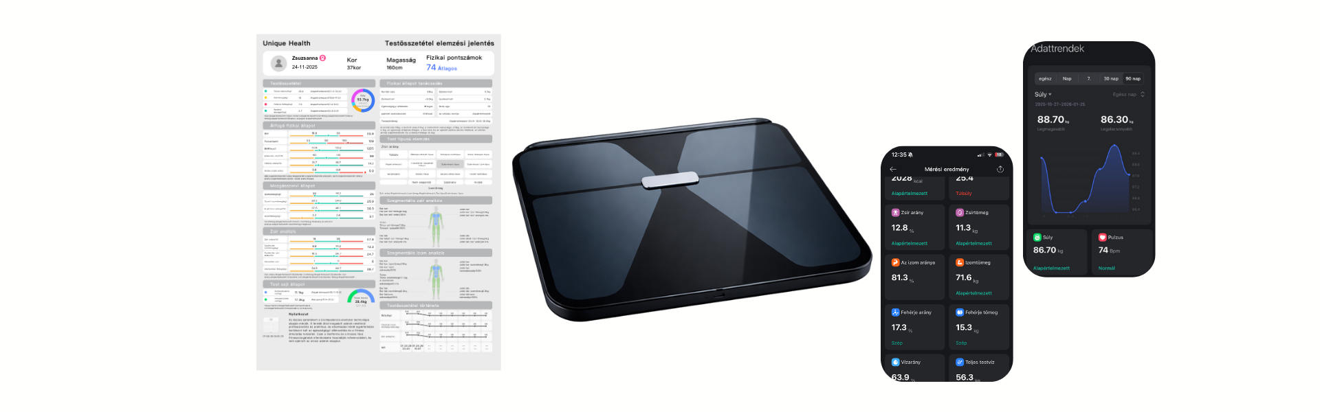 8 frekvenciaszenzor segíségével, rendkívül pontosan méri a testsúlyt, a teljes testösszetételt és a szívegészséget, így támogatva a fejlődésedet és az egészséged tudatos irányítását.